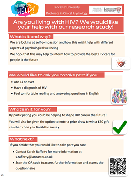 We are looking for participants who have a diagnosis of HIV, are over 18 years of age, and who feel comfortable reading and answering questions in English. If you meet these criteria and would be interested in participating in this research, please scan the QR code on the poster displayed, or click the link below, which will take you to the study website. Please ensure that you read the participant information sheet (the first page you will be taken to) carefully to ensure that you would like to participate, as this contains important information regarding some of the language used in the questionnaire.
